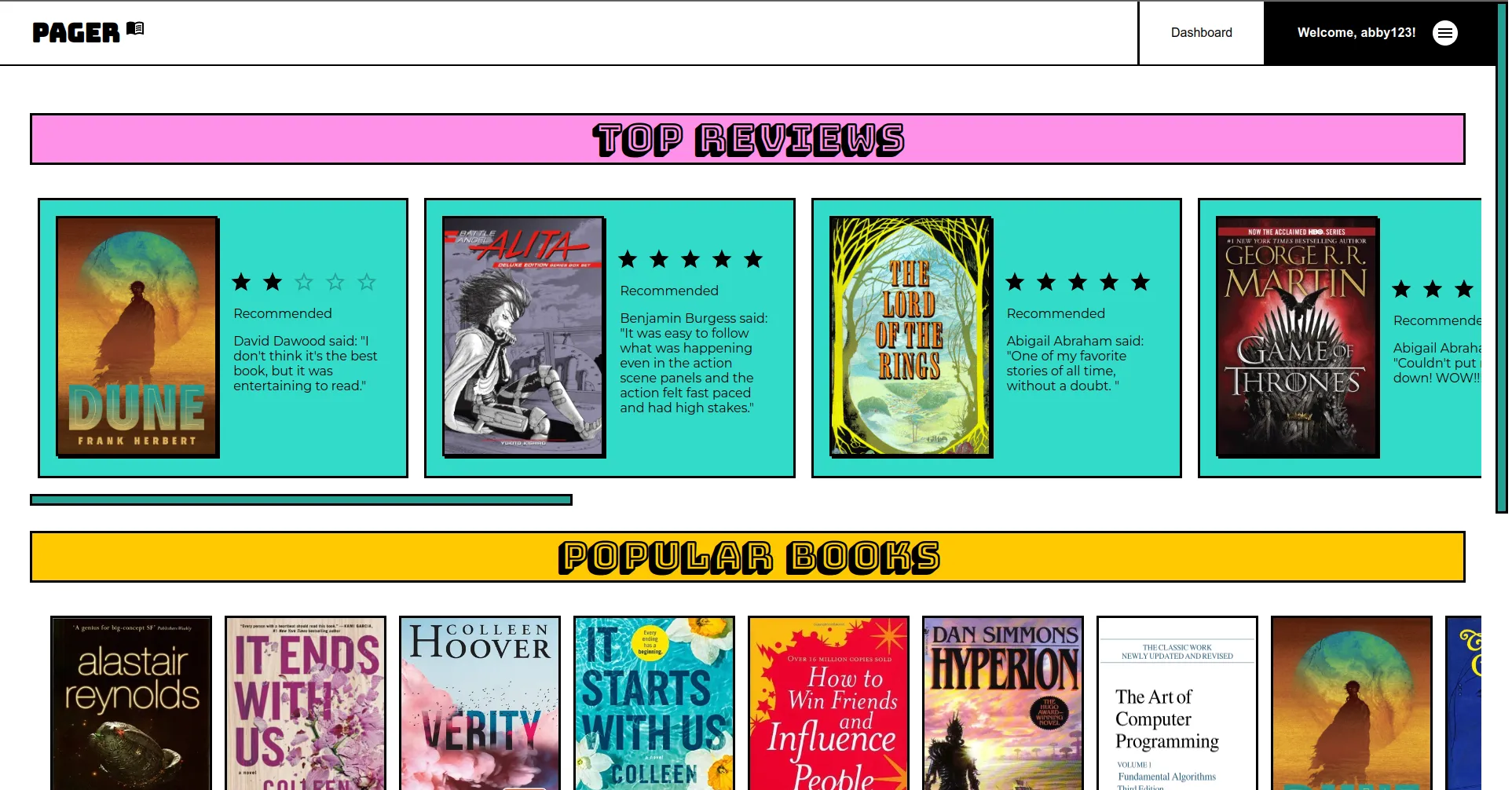 Pager is a simple, user-driven social media platform designed for readers to collect, review, and curate lists of their favourite books.